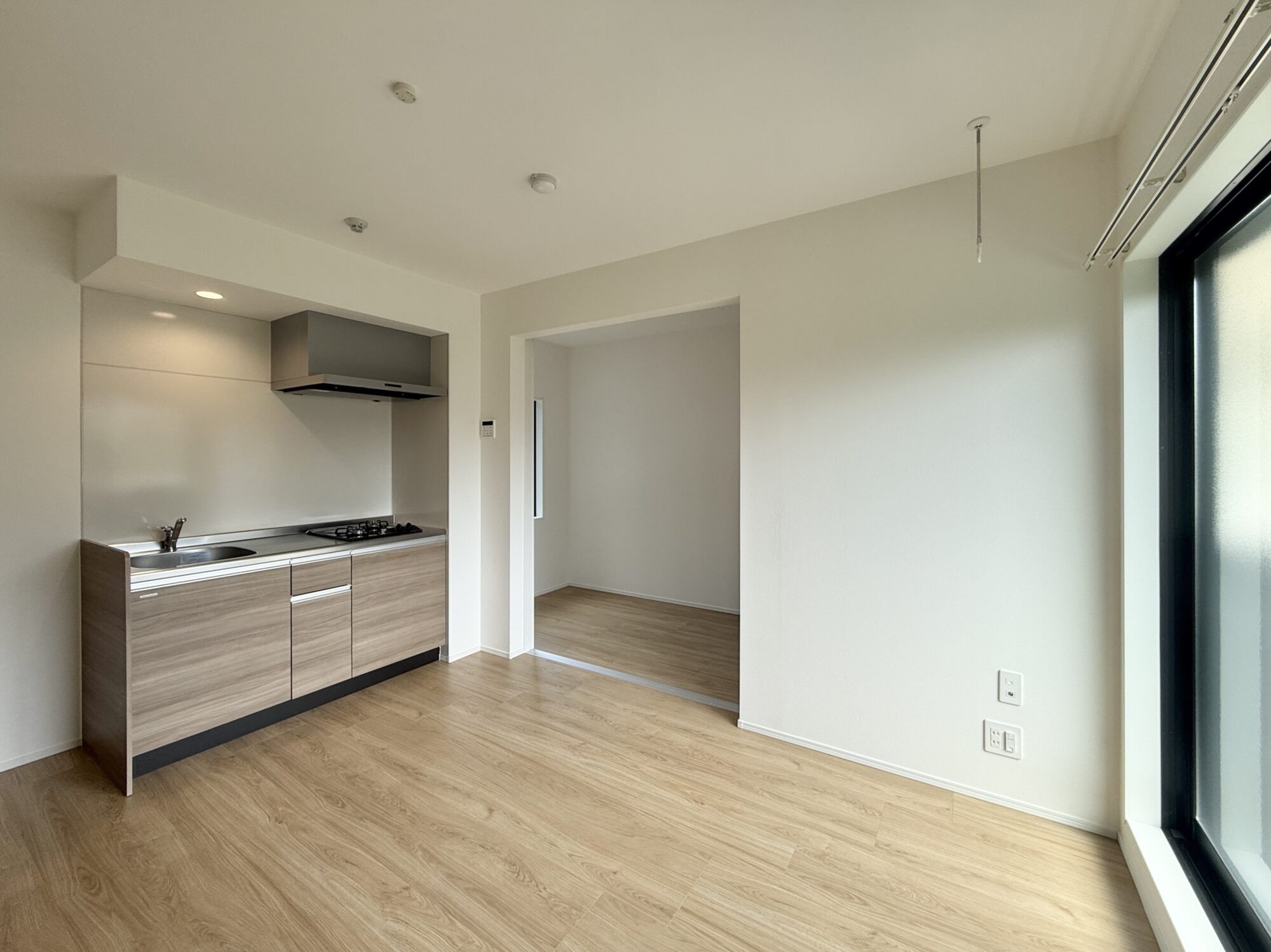 キッチンはお部屋のタイプによって対面式と壁付けの2種類が混在。住む人の要望に合わせて選べるようになっています。いずれもガスコンロが備え付けになっていてとても便利。窓から差し込む光も良好。外観のクールな表情とは打って変わって、室内は明るく優しげな印象です。