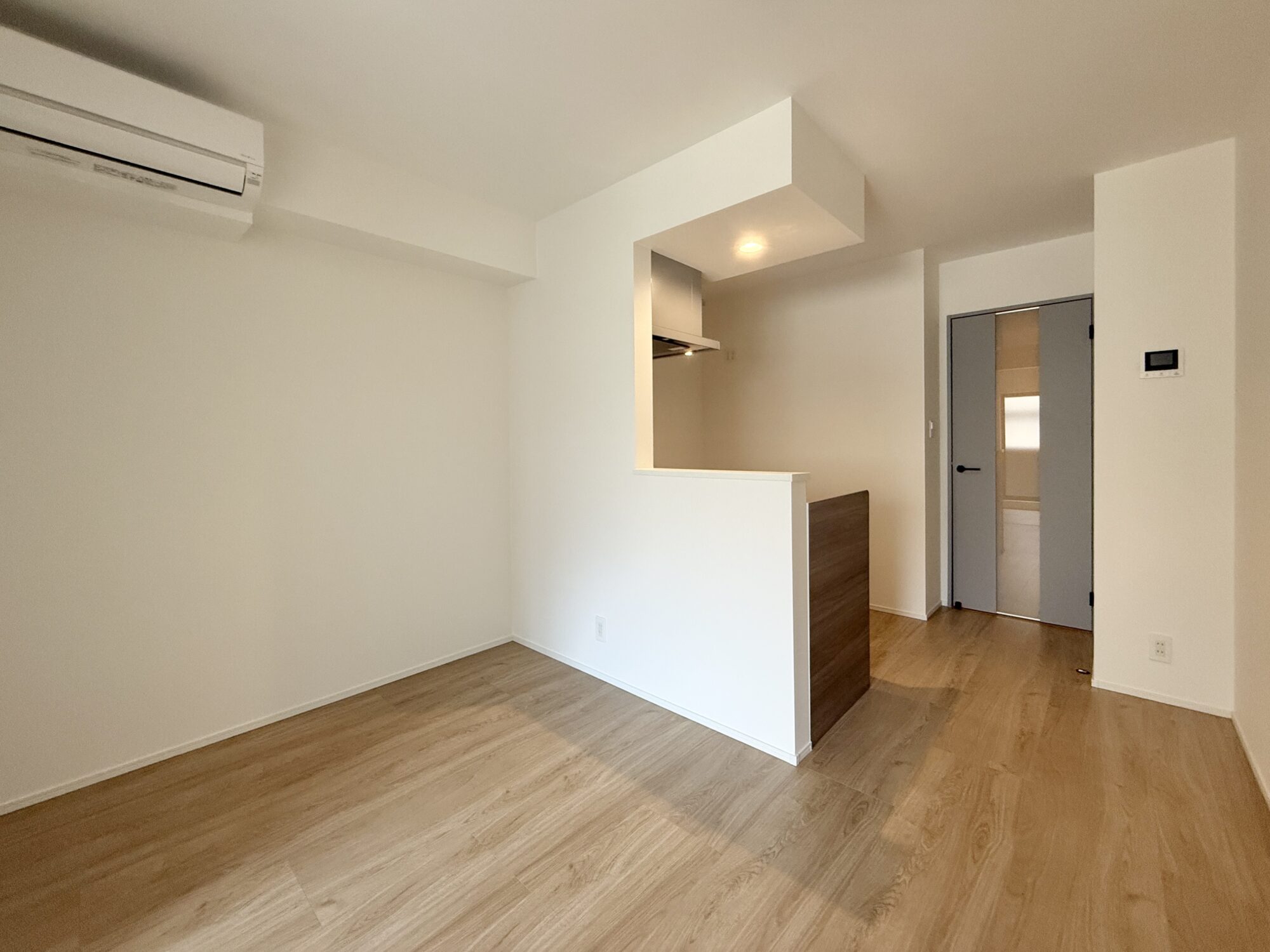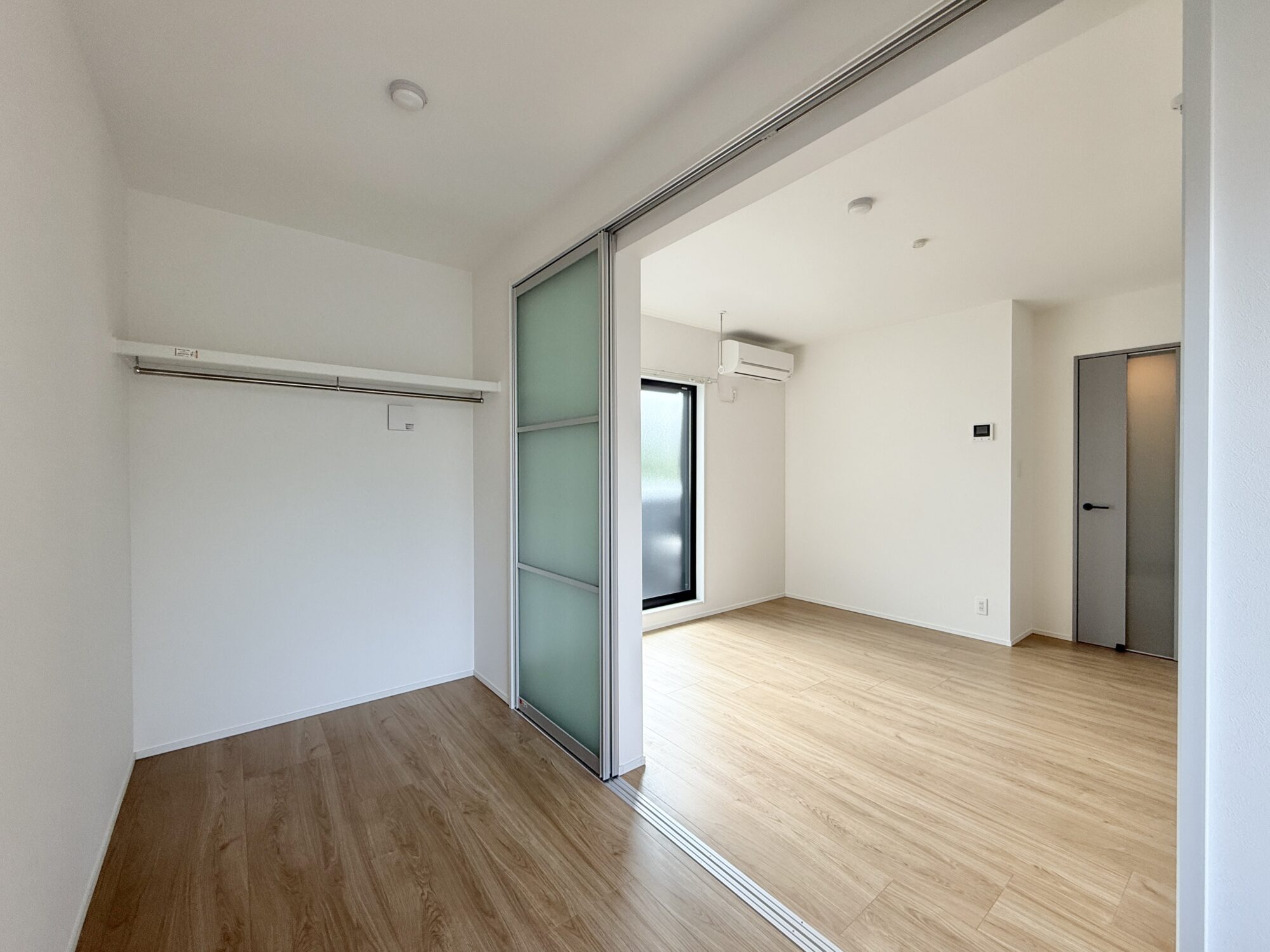 寝室はリビング全体が見渡せて収納力もバッチリ。2人暮らし世帯も想定してセミダブルサイズのベッドが置ける仕様になっています。曇りガラス製のドアを閉めれば、開放感も保ちつつそれぞれのお部屋のプライバシーもしっかり確保できます♪