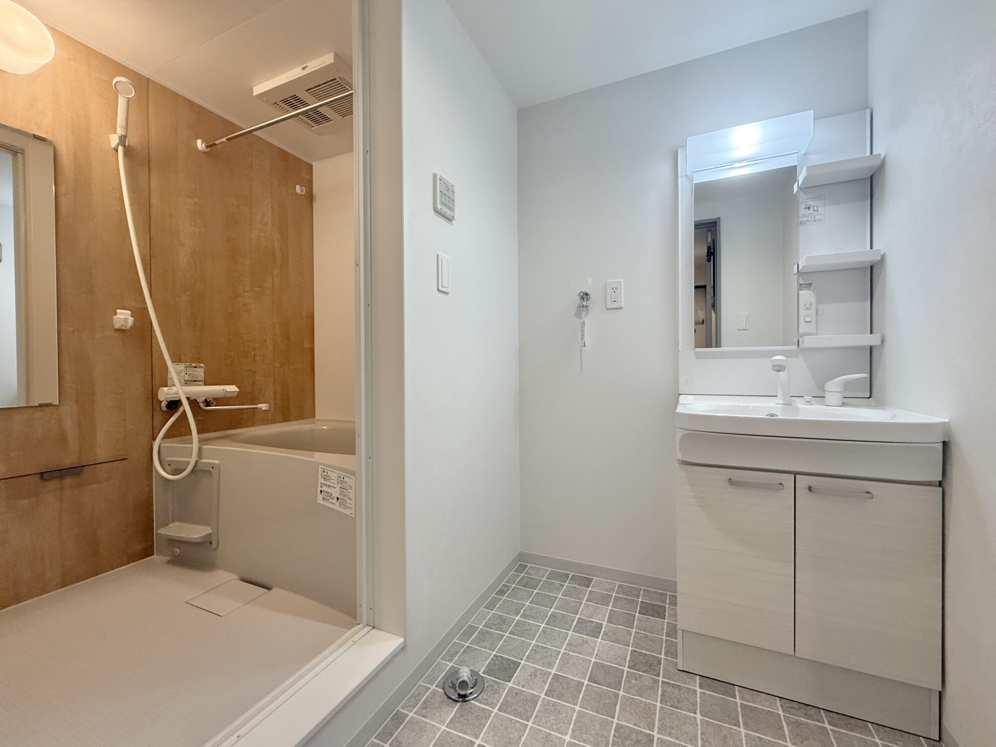 家事動線の良い洗濯機置き場&脱衣スペース。浴室の温かな木目調の壁面は、疲れた身体にほっとした安らぎをもたらしてくれそうです✨