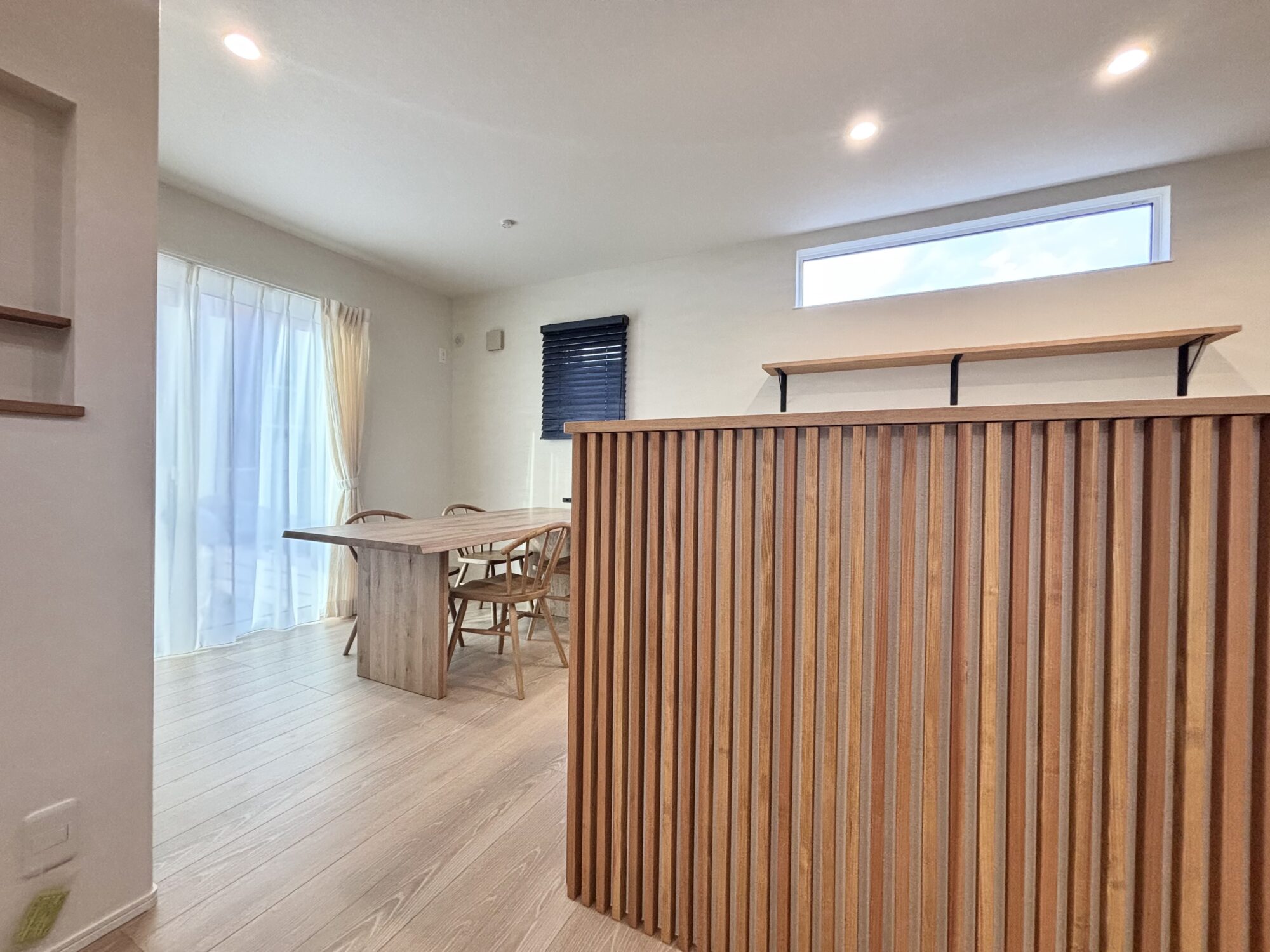リビングを入ってすぐ目につくのが何といってもこのキッチン周りの木格子。
