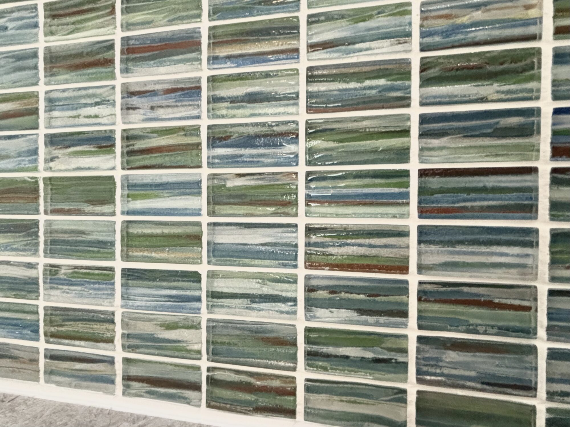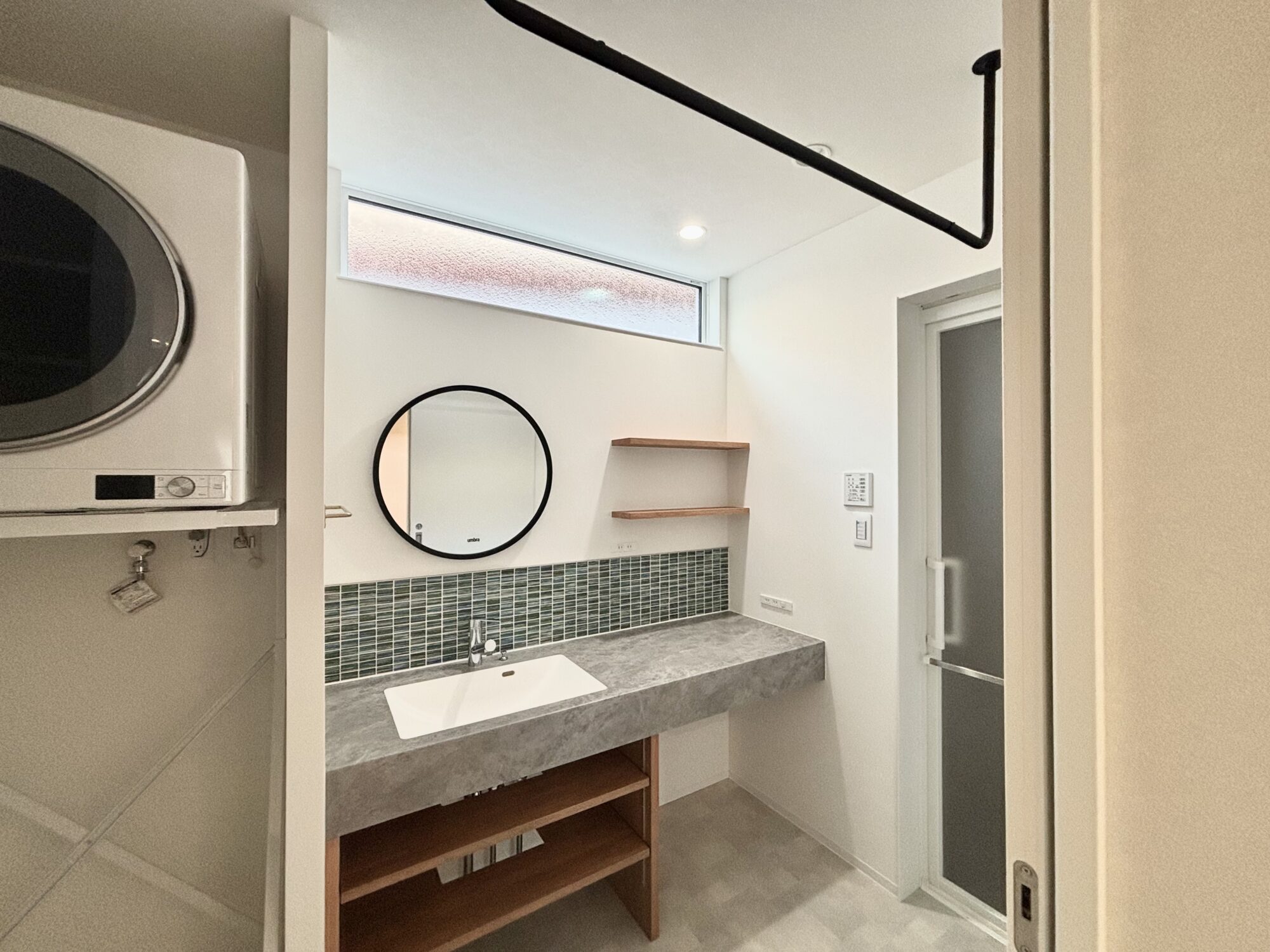 洗面台には爽やかなガラスタイルを施し、洗面鏡や物干しには黒のアイアンを加えてアクセントに。