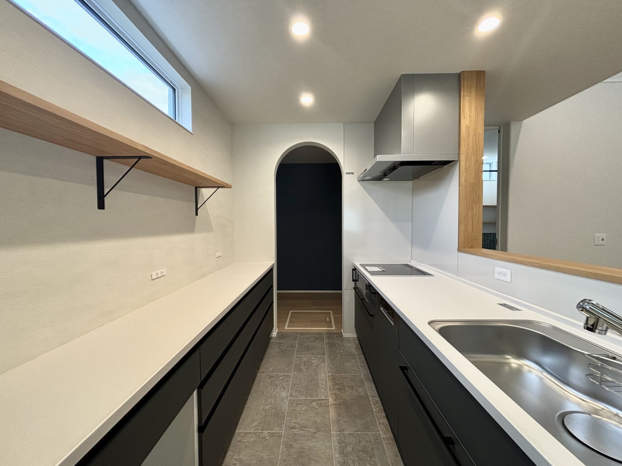 キッチンそのものの収納力はもちろんのこと、奥にはパントリーが隣接。入口の垂れ壁のアールはシンプルながらも遊び心のある雰囲気を醸しています。