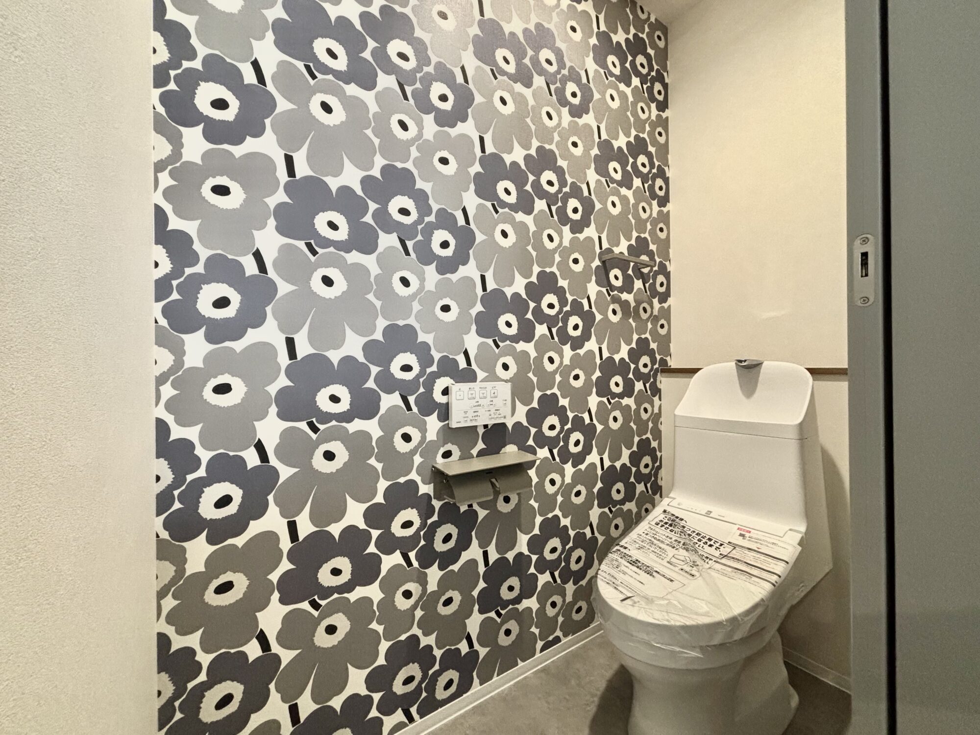 2階のトイレは奥様がお好きなマリメッコのクロスを用いてモノトーンでありながら華やかな雰囲気の空間に仕上がっています👏✨