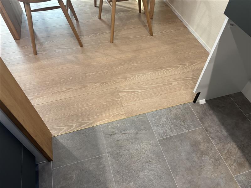 キッチンとリビングの境目には真鍮を差し込んでスタイリッシュな印象に。
