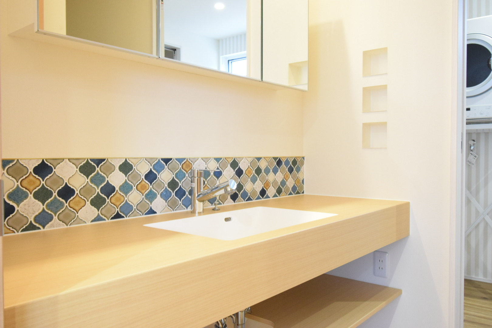 洗面台にはレトロな雰囲気のあるモザイクタイル✨