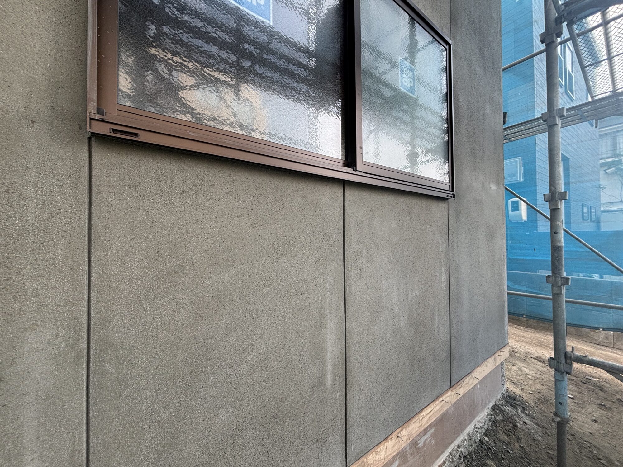 塗り壁によってきれいに作られています。まだ施工したばかりなので完全に乾くまでここからもうしばらく時間を置く必要があります。乾いたらこの上に塗装を施していくのですが、周りの外壁となるべく近い色合いになるように塗料を調合し、塗布していきます。