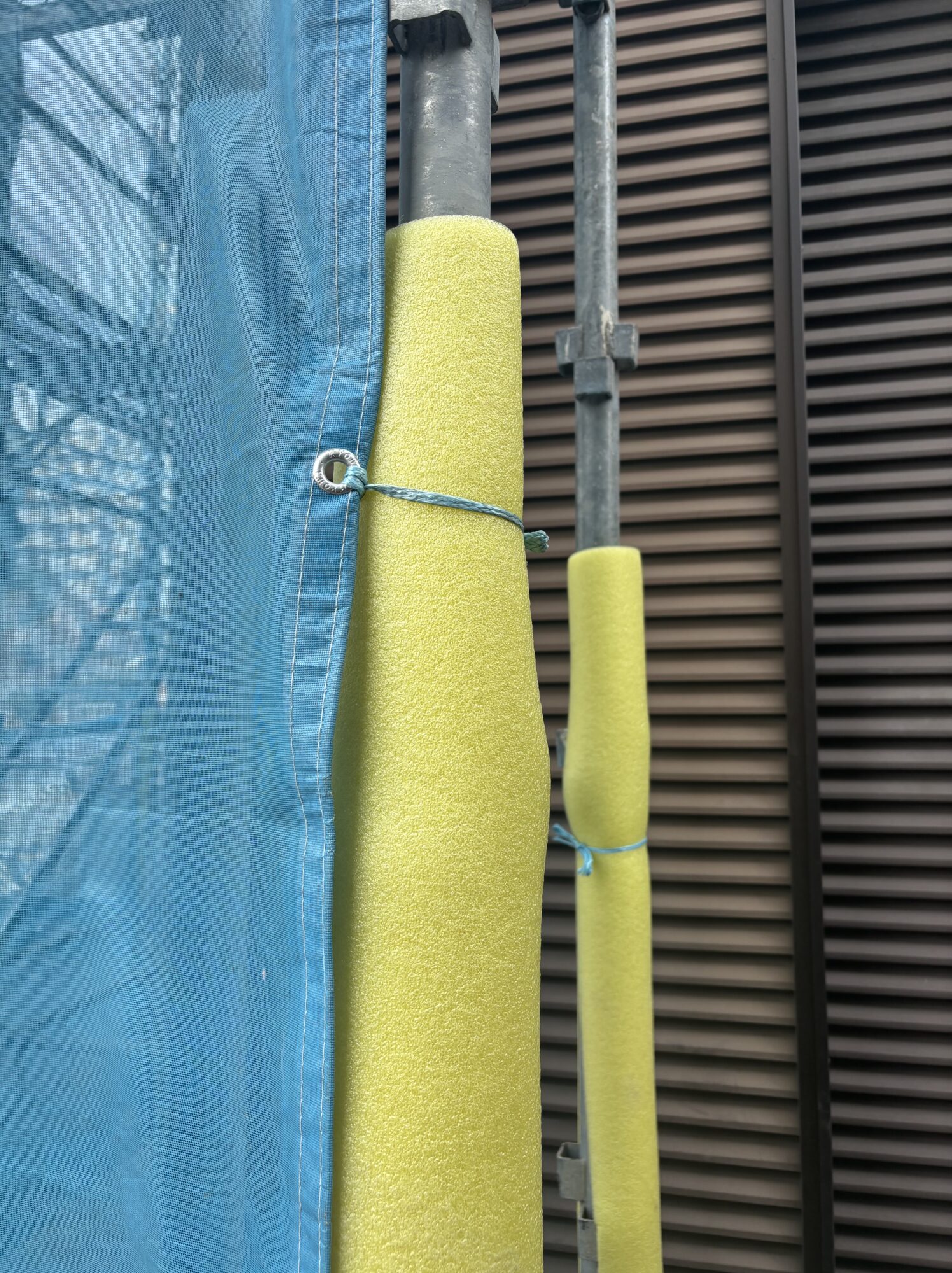 最後におまけの一枚。人の背の高さくらいの位置まで、足場にいくつかこのようなクッション性の養生が巻かれていました。これは足場の寒さ対策、、、