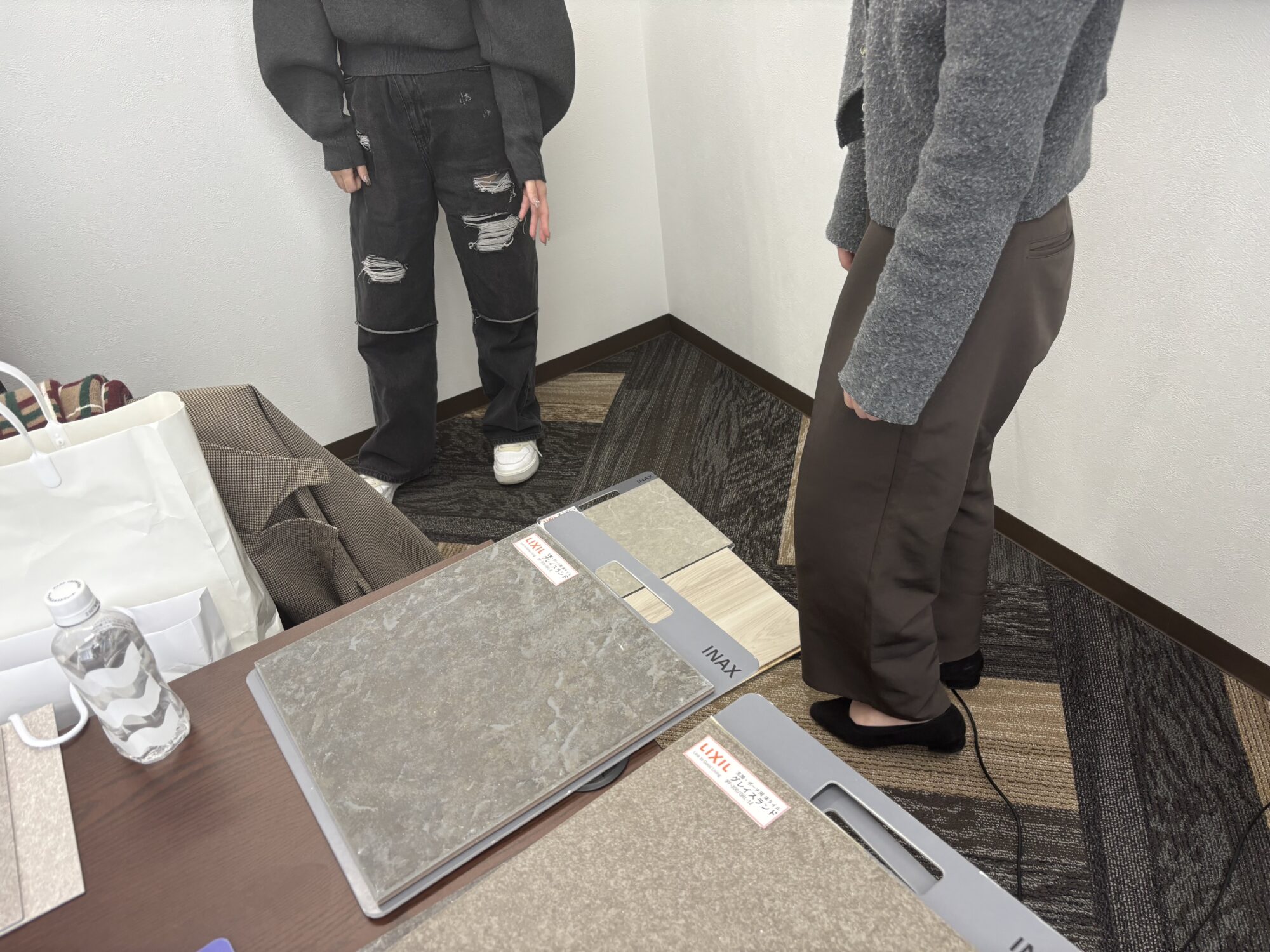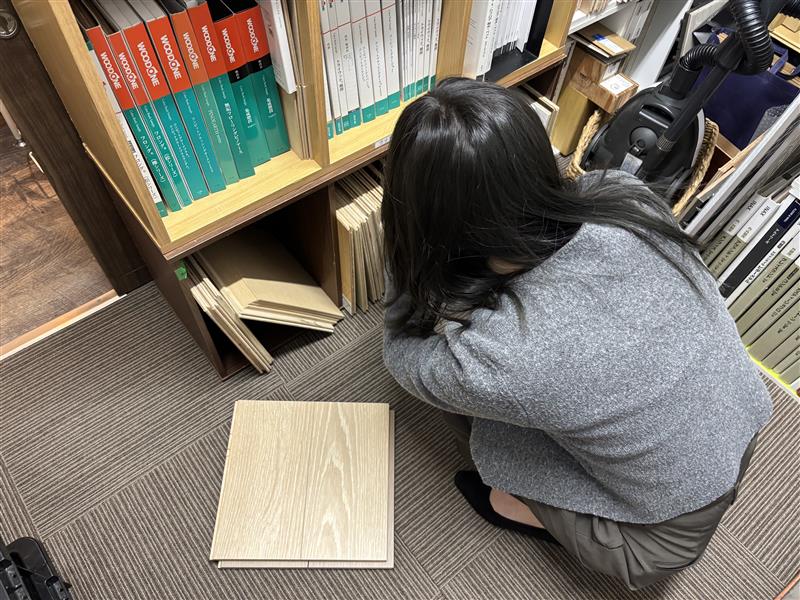 床材を床に並べて、実際の立ち位置からの色の見え方を確認していたのでした。笑