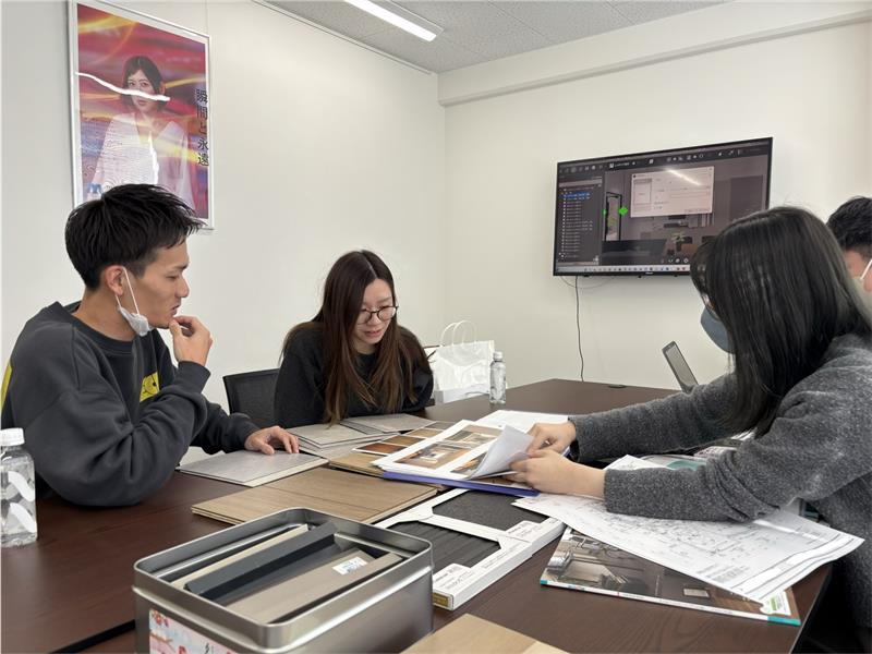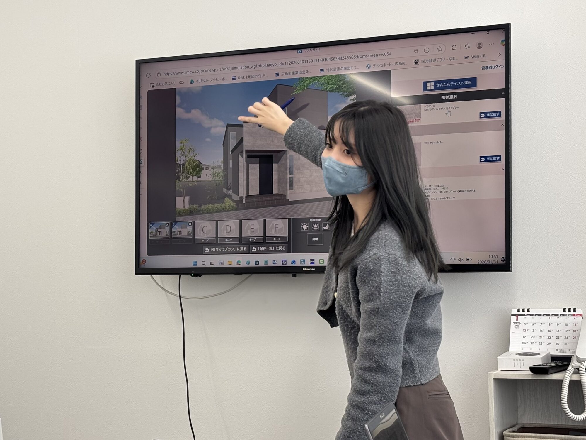 ↓こちらは外装の色決め中。こんな風にパースの画像を目の前でご覧いただき、実際の製品の色をその場で何パターンか差し替えながら細かい部材を決定していきます。