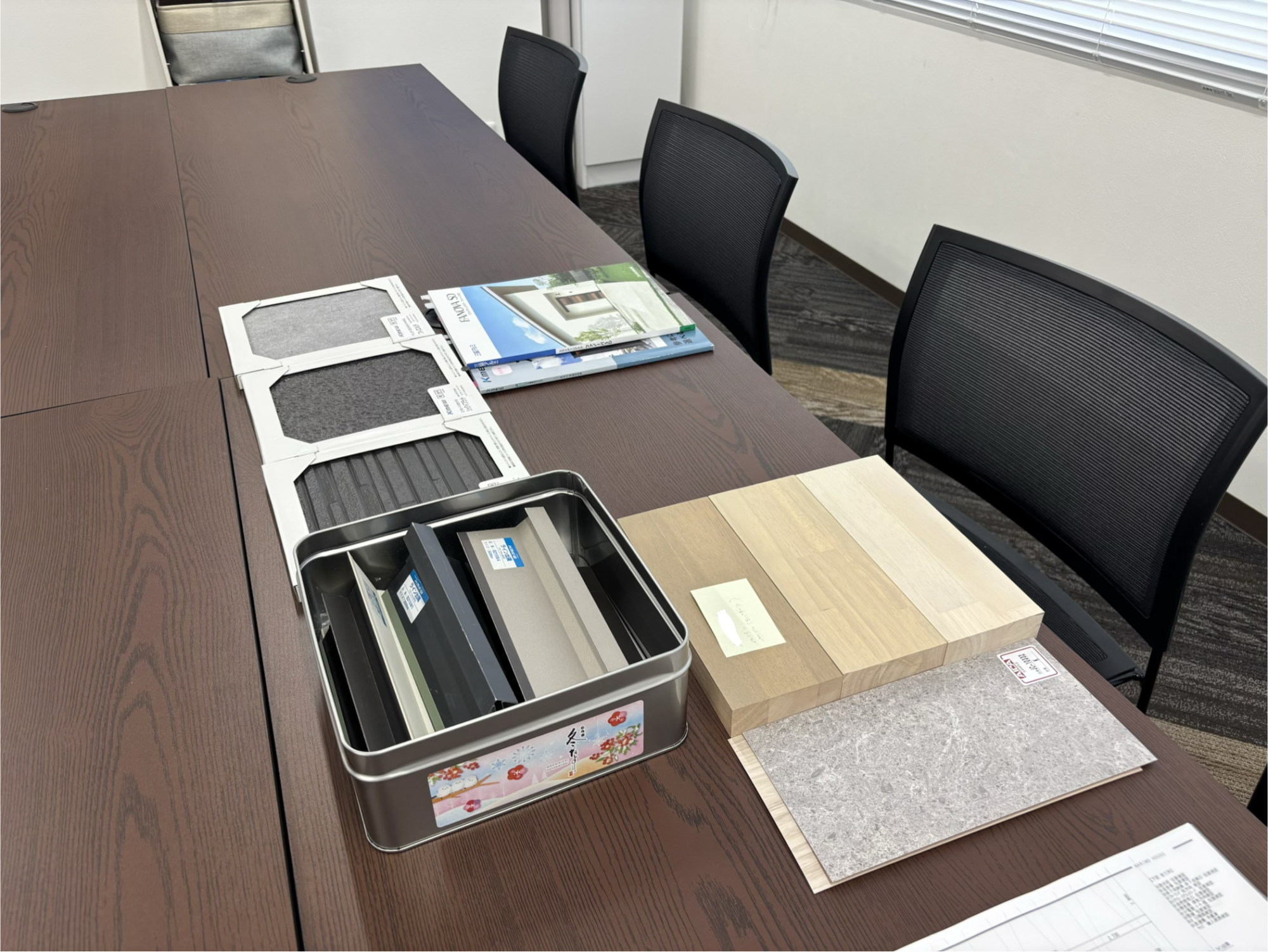 外壁材、床材やクロスなどなど、打ち合わせに必要なサンプルを集めて打合せ室に運んでいました。