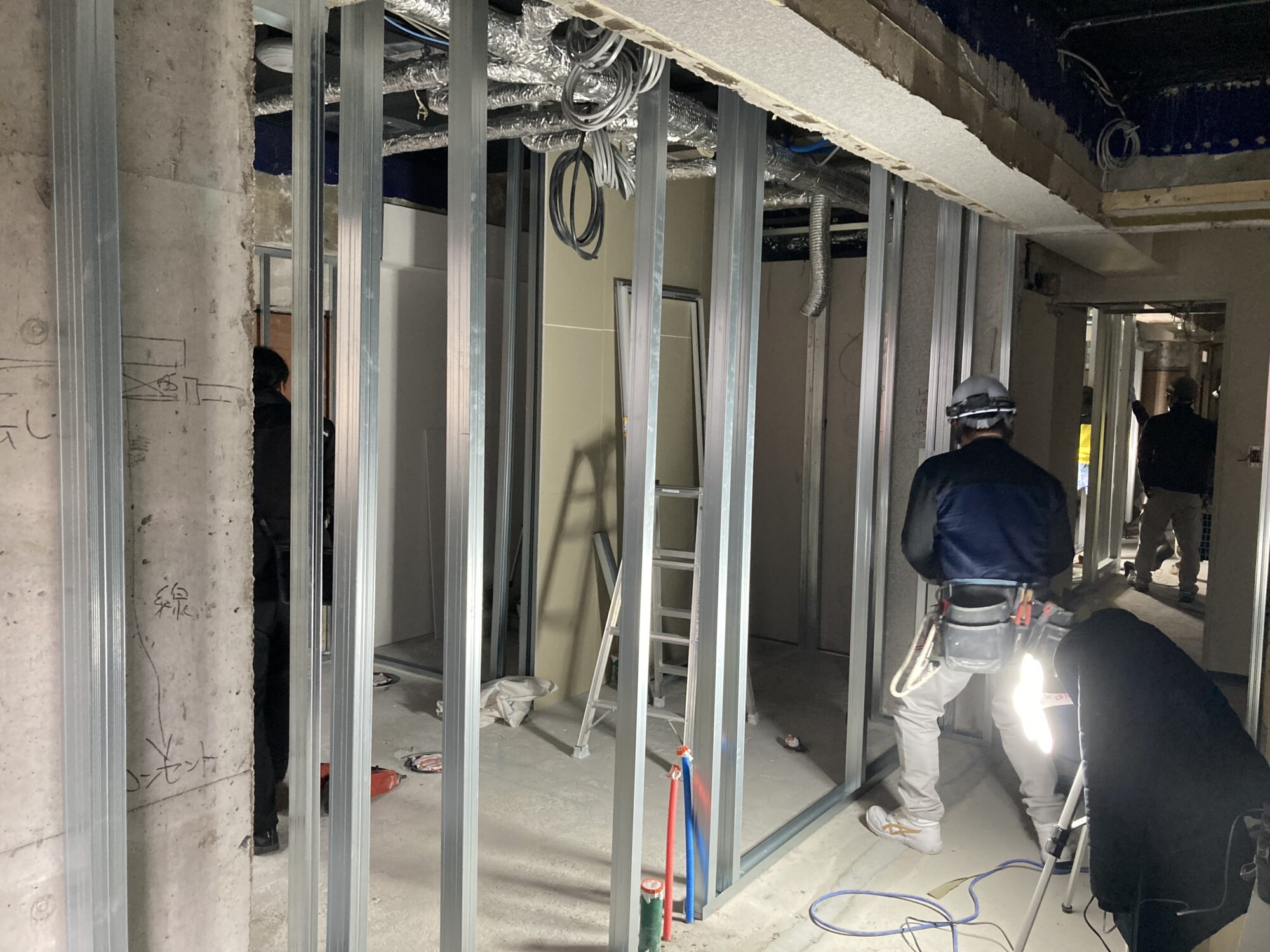 ↑“軽天(けいてん)”と呼ばれる鋼材で壁(間仕切り)の骨組みを組み立てているところです。天井と床の上下にランナーと呼ばれるレールを打ち込み、その間にスタッドと呼ばれる間柱を組み込んでいきます。