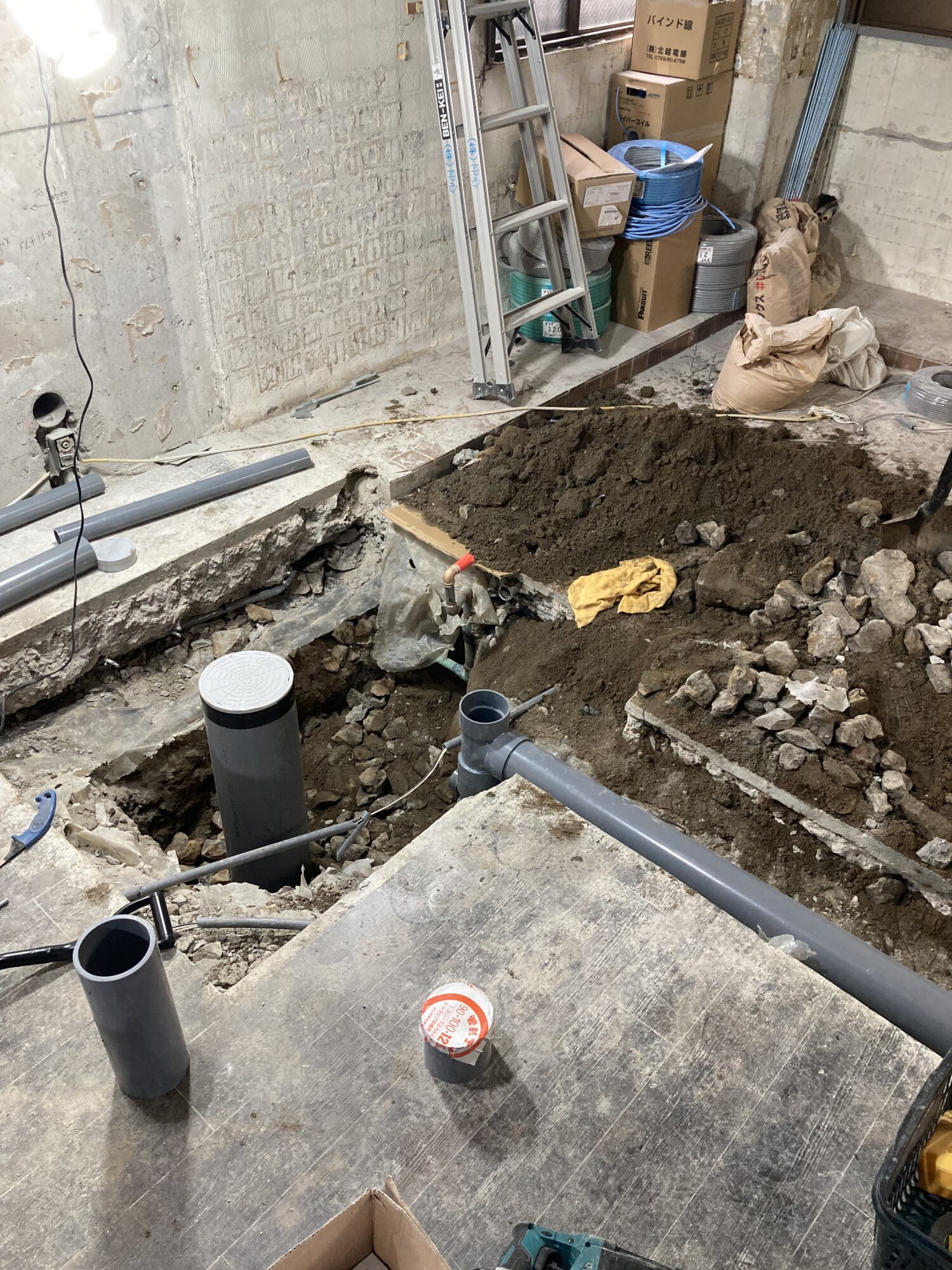 そしてこちらは下水の配管工事を行っているところです。今回のリノベーションでは間取りも大きく変わるため、地中深くを掘り起こして管の配置を変えていきます。
