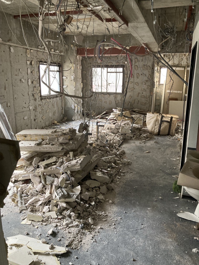 こちら↓の写真は、その取り壊した壁の瓦礫を写したものです。建物内なので当然重機は使えないため、これらはのちのち人の手によって建物の外へ運び出していきます(とても重たそうです…😣💦)